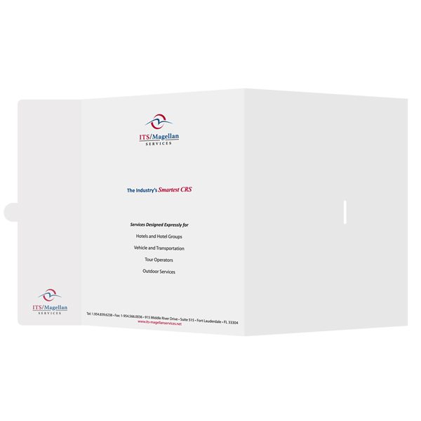 This presentation folder for ITS/Magellan Hospitality, a hotel distribution company, uses a tuck tab die cut design, keeping the entire package secure and mobile. The company’s logo is featured on the lower right so that recipients will notice it right before opening. Meanwhile, the back cover highlights the services the business offers as well as their contact information.