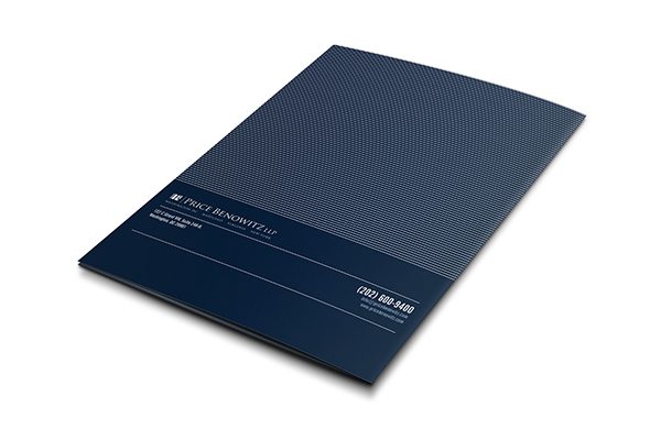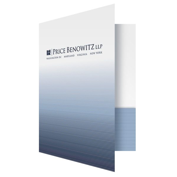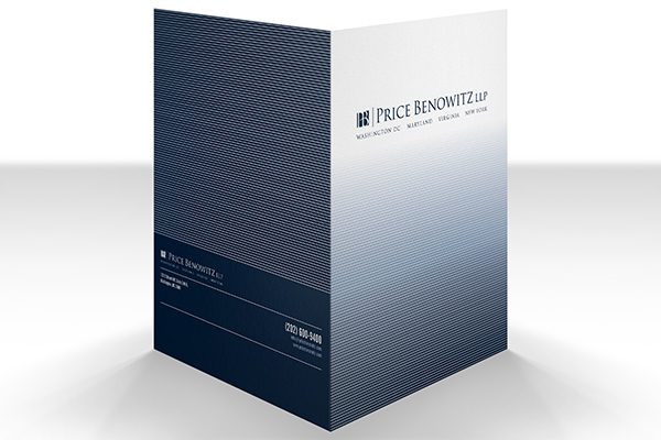 This attorney presentation folder technically uses a single color (navy blue, to suggest security and reliability), but employs patterns and varying levels of opacity to create a unique sense of visual texture. The fading effect on the folder’s front cover helps to draw the viewer’s attention towards the name of the law firm.