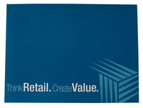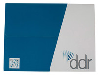 A modest blue and white color scheme presents a put-together image for real estate investment trust DDR. The two colors slant diagonally to suggest innovation and motion, while the back panel features the brand's slogan and logo in light blue to add visual intrigue.