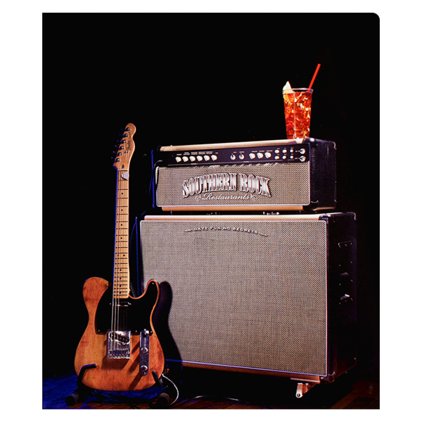 A guitar and amp convey the "rock" in Southern Rock Restaurant's name on the cover of this binder, while a glass of refreshing iced tea entices customers to look inside.
