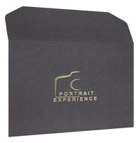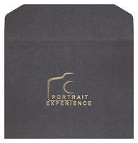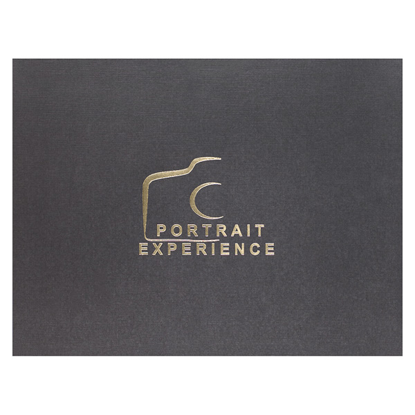 Two curved lines make up half of a camera, letting clients' imaginations finish the picture. Both lines guide the eye to the brand's trendy sans serif font, emphasizing its name. The Portrait Experience logo is stamped in Metallic Gold foil, which brings light to the black linen stock. A woven texture also sets the stock apart from the smooth foil.