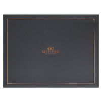 The shiny copper foil gives a sense of motion to the tiny horse and carriage logo. The dark gray stock matches the brand name, Greystone on Hudson. Its textured panels also contrast the smooth foil for a luxurious look and feel.