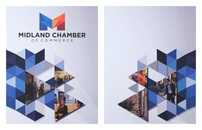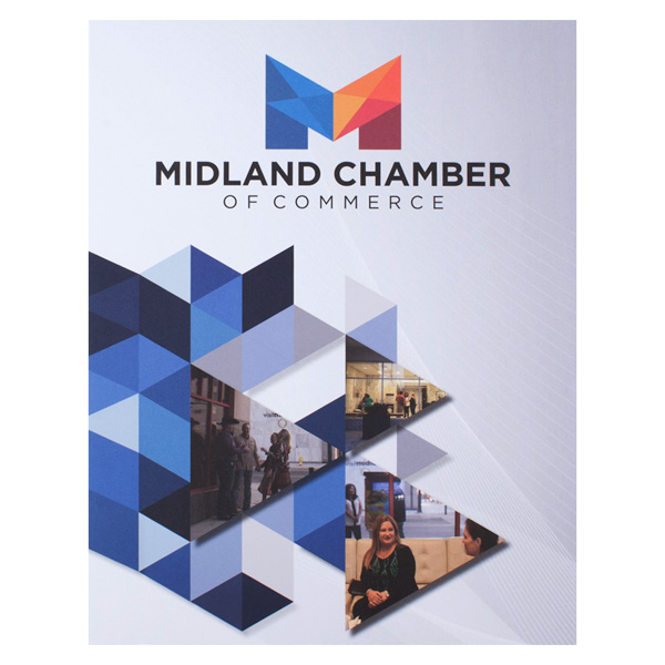 Triangles on the cover of Midland Chamber of Commerce's report cover direct recipients to check out the content inside. Each triangle has an image from the town inside of it, surrounded by three-dimensional blocks to illustrate the chamber's role as part of the community's foundation.