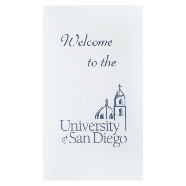 The University of San Diego welcomes guests with thin blue lettering in the school's color, while a slightly round script font adds a personalized touch to the greeting. The logo depicting campus architecture is the only image on the minimal design. Two interior pockets hold gift cards, meal tickets, or other small items.
