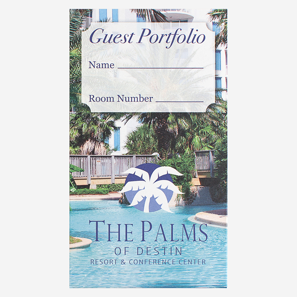 Both inner panels inform guests about amenities and services. The Palms' address is on the left pocket, with parent brand Visionary Destin's logo at right. Guests can learn more about the resort on the back cover.