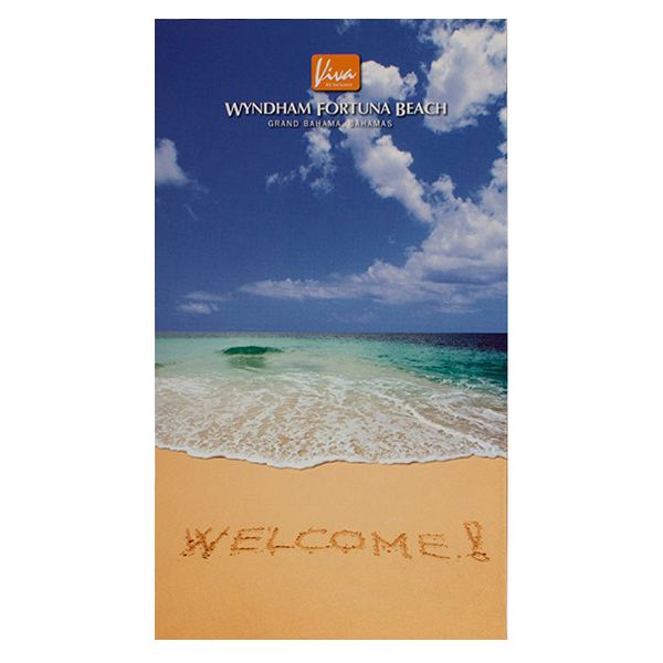 A gentle tide rolls toward the word "Welcome!" etched into the sand at Grand Bahama Island, greeting visitors at the Viva Wyndham Fortuna Beach resort. The photo gives guests a glimpse of the gorgeous scenery they can expect to enjoy during their stay.