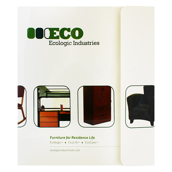 To make the most of this 3D binder, Ecologic Industries turned its exterior into a mini catalogue. Photos wrap around the design, showcasing the brand's eco-friendly dorm and college furniture. Each photo has round corners for a casual look that appeals to modern students, while green text emphasizes the brand's eco-consciousness. Velcro closures secure the flap until users are ready to browse the materials in the 1" metal rings.