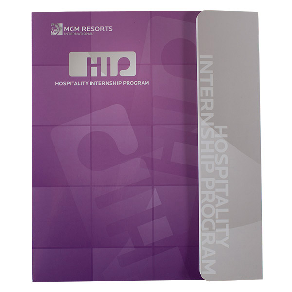 Gray accents subdue the lively purple background on both covers of MGM Resorts International's binder promoting its Hospitality Internship Program, a ten week paid internship to introduce college students to the hospitality industry. Both covers exhibit a grid of interlocking squares with the HIP logo repeated between them. The program's name spelled out vertically along the flap challenges the audience to spend more time reading and engaging with the unusual text.