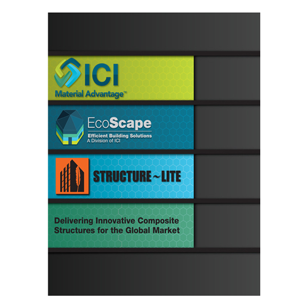 Thick gray bars make this design look like one of the composite skins Innovative Composite, Inc. manufactures for modular homes. A honeycomb pattern and the brand's bright colors highlight its departments and slogan with a light texture. On the back panel, the colors appear in a new order to freshen up the design and still reinforce the brand's identity. The gray bars on the reinforced edges tie the interior and exterior together. A pale ICI logo blends into the left pocket, so as not to distract from the contents.