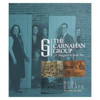 A complementary cyan-and-orange color scheme dominates this design, with a photo of The Carnahan Group's staff forming the cover's background. Smaller images of beautiful homes give recipients a sneak peek of what the company has to offer.