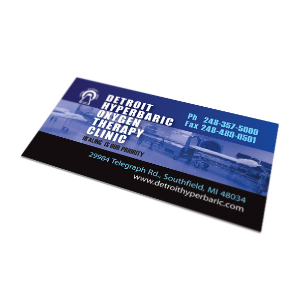 Soothing shades of blue calm patients and families of Detroit Hyperbaric, an oxygen therapy center serving the Metro Detroit area. A mini photo showcases its facilities; blue colorization prevents the oxygen chamber from looking scary or cold. Contact information in a black bar also relaxes viewers, as it avoids the medical field's usual glaring white designs. The overall effect is one of peace and tranquility—two things patients will likely experience as a result of receiving hyperbaric oxygen therapy.