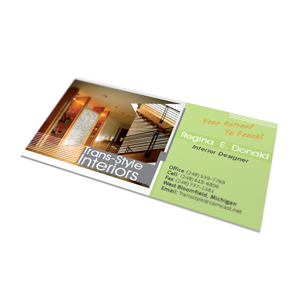 Warm wood grains and soft, glowing lights illuminate a photo that occupies more than half of Regina Donald's business card. The interior designer's name and contact information are written on a light green background. The springtime color puts a playful, lighthearted spin on the high-end photo. An orange tagline at the top matches the color of the lights shining on the home's wall, tying the design together.