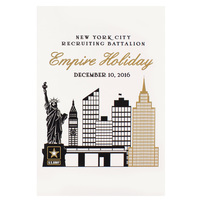 The New York City Recruiting Battalion opted for a stately design for its holiday celebration. Stylish serif and script typefaces suggest luxury and regalia, while the classic imagery highlights NYC's most famous landmarks. The U.S. Army logo symbolically serves as the base of the Statue of Liberty; gold and black ink incorporates the Army's color branding throughout the design.