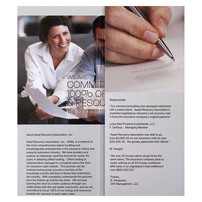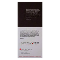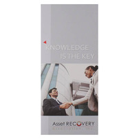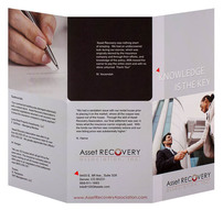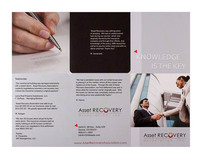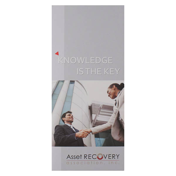 Insurance claims can get complicated, so Asset Recovery Association breaks it down with this tri-panel design. Crisp images and black blocks separate the text. On the front, a tiny red triangle points to the brand's "Knowledge is Key" slogan; the same shape draws attention to the contact information on back.