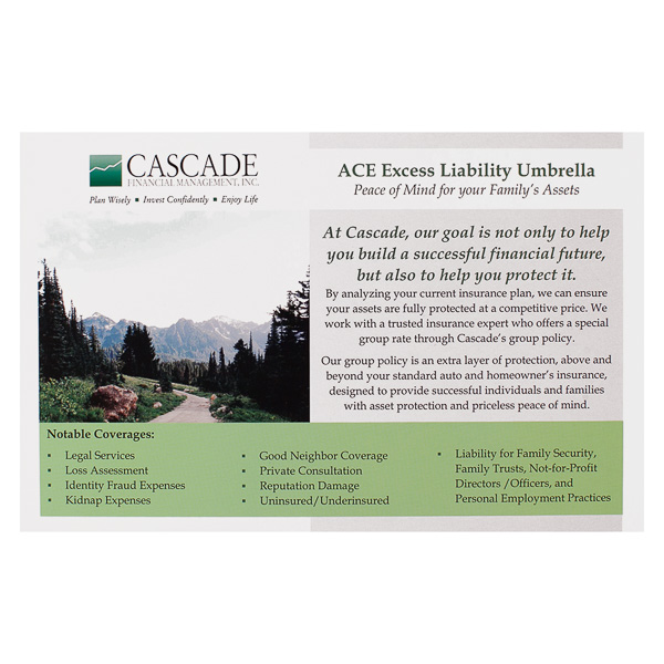 A scenic photo of a mountain trail gives a nod to Cascade Financial Management's location in Colorado and adds a relaxing feel. At right and bottom, readers can find details about the firm's asset insurance. Green and gray blocks separate each section with Cascade's brand colors. The post card's flip side simply holds contact info, partner info, and a call to action on a plain white background. Its logo at the top reinforces the brand's identity.