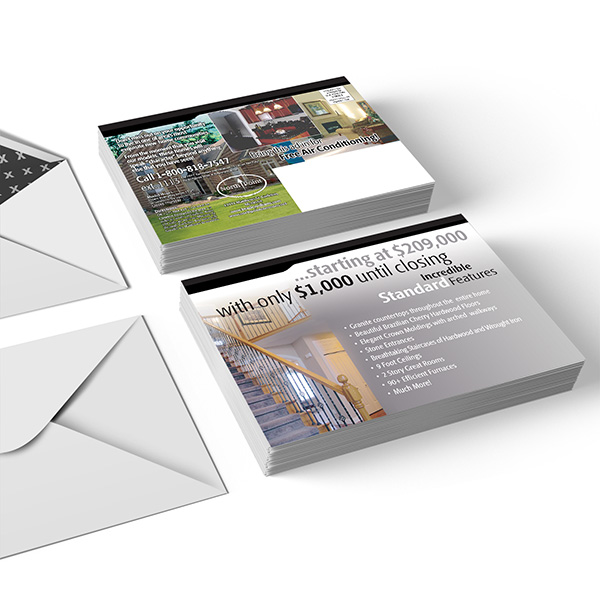 Home builder Baezley promotes its new creations with this business post card. A starting price and a list of amenities on one side of the card are written on a gray background that blends seamlessly into a photo of a stairwell, as if it's a wall in the home. On the flip side, the post card features contact information superimposed over a photo of a home's exterior, with an interior shot in the upper right corner.