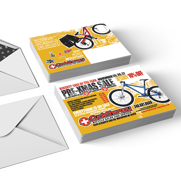 A bicycle props its front tire on the Cycle Therapy logo on this seasonal post card. The tire and handlebars point at the list of discounts available at the bike shop's pre-Christmas sale.