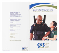 The Centre for Neuro Skills highlights its rehabilitation services with this photo of a staff member helping a man learn how to walk after a brain injury. Blue and green text ties in the brand colors, as do the curved lines that hint at the centre's role as a bridge to recovery.
