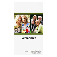 New Hope Church gives guests a taste of its atmosphere with photo collages of couples, kids, and families. Green borders frame the photos, turning them into one cohesive visual element instead of many small parts. The church's mission is written on the left inner panel, while its contact information and service times are listed on the back cover for visitors who want to learn more.