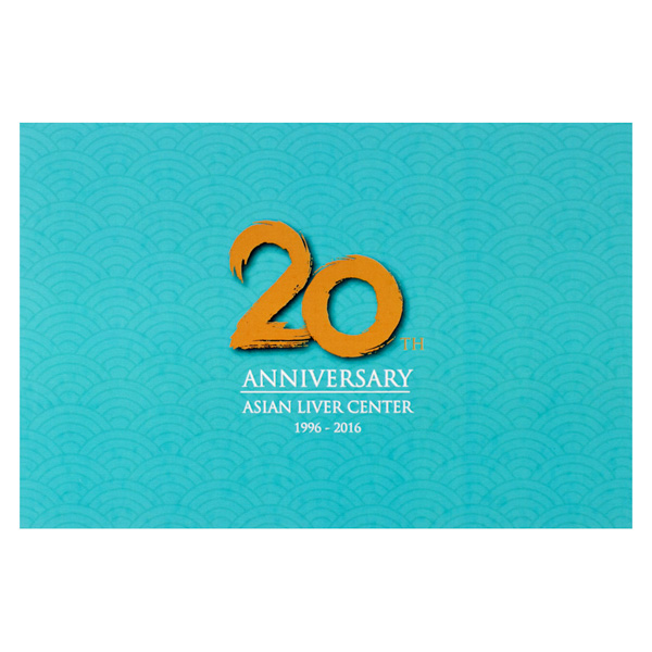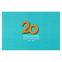 Donors to the Asian Liver Center receive this thank you card, which also marks the center's 20th anniversary. The gold and teal color scheme evokes warm and calm feelings. A thank you message is inside, while center contact information is on the back.