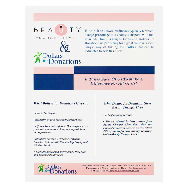 Dollars For Donations' sell sheet uses pale pink colors and feminine imagery to create a sense of gentle, graceful kindness. The front of the sheet describes the purpose and mission of the organization, while the back goes into greater detail about how their donation process works and its benefits to all of the people involved.