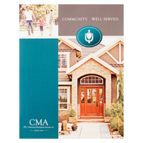 An image of what could be clients' front door dominates the Community Management Association, Inc.'s sell sheet. The organization, which offers rental assistance programs, also features a happy family with the tagline "Community. Well Served." The blue and white color scheme evokes feelings of security, which is something families will feel when they get into their homes.