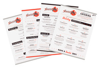 Sweet P's sell sheets' red and black color scheme brings to mind hot, spicy flavors. The bright, red flame in the logo fits the barbecue restaurant's theme. Information on the sheets is organized and easy to read.