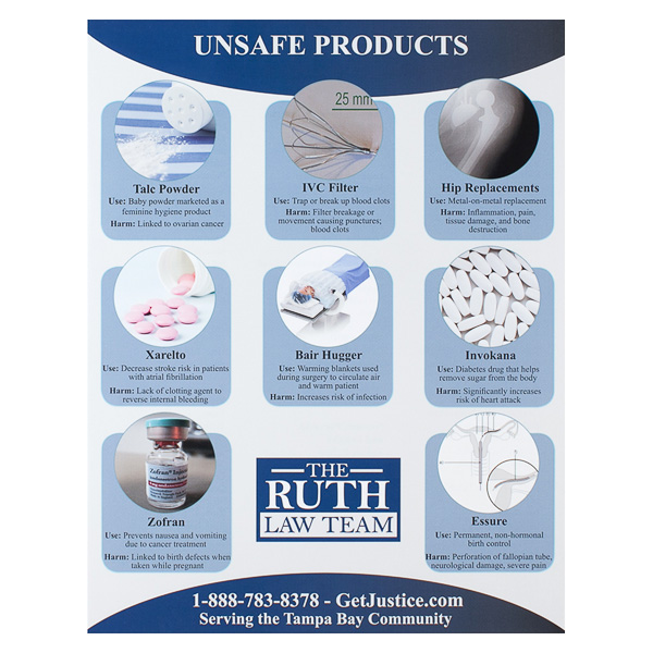 Designed for The Ruth Law Team, this marketing sheet alerts Tampa Bay area residents of harmful products and liability cases. On the front, products are marked with an image and a blue square to distinguish one from another. The flip side provides details about the cases, sorted into three columns to make them more readable.