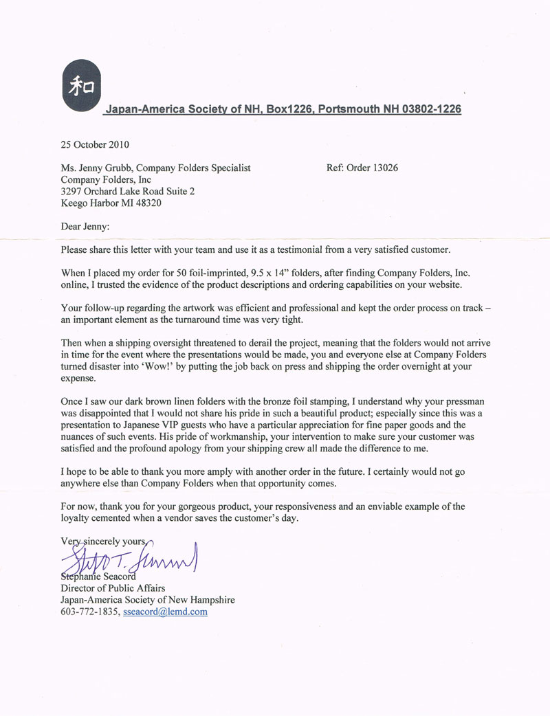 I hope to be able to thank you more amply with another order in the future. I certainly would not go anywhere else than Company Folders when that opportunity comes.