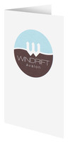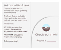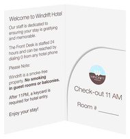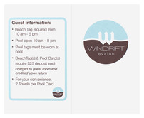 The Windrift Hotel's light, airy design welcomes guests to New Jersey's south shores. Its sky blue and brown circle logo is smooth and modern, especially when paired with clean white panels. Hotel policies and room information are all located on the interior, with pool and beach rules easily accessible on the back cover.