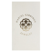 Daniel Gibbings Jewelry uses this folder to give customers a preview of its products. A Metallic Gold foil stamp adds a luxurious shine to the design and a smooth texture on the Natural Linen stock. The company name is in all caps to illustrate it is an authority in its field. Contact information is on the back, along with the company tagline.