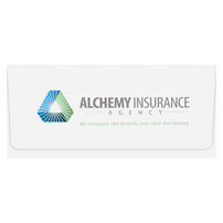This minimal design for Alchemy Insurance features the brand’s logo and colors. The gray and green sans serif font adds a clean, elegant look and matches the green and blue triangle, which suggests power and protection.