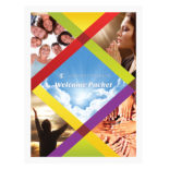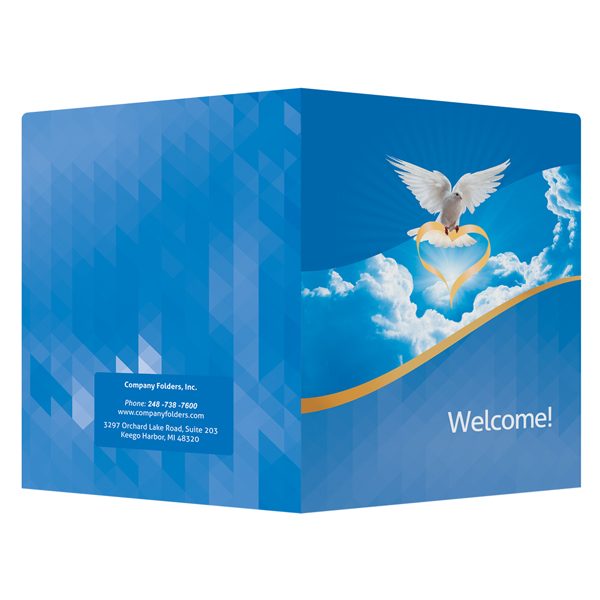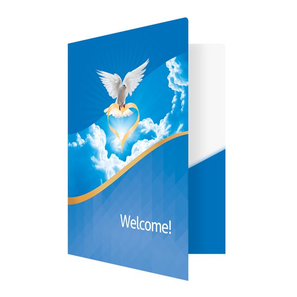 This design template can be used to create welcome folders for church visitors, containing church programs, congregation contact info, informational leaflets or other literature that a religious group might present to newcomers.