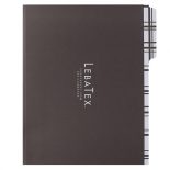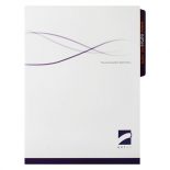 The horizontal layout of the presentation folder allows it to securely hold onto important documents without the need for pockets. The custom printed tab on the top directs the recipient to the artist’s website and is visible whether the collateral is closed or open.