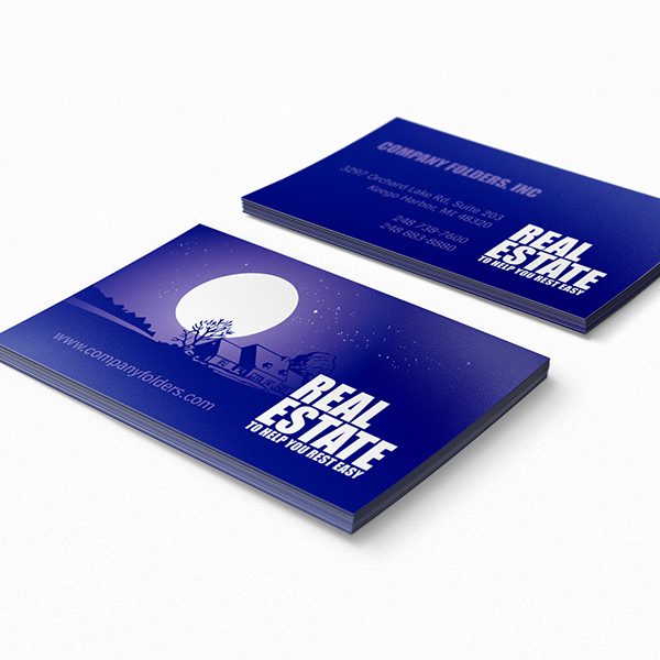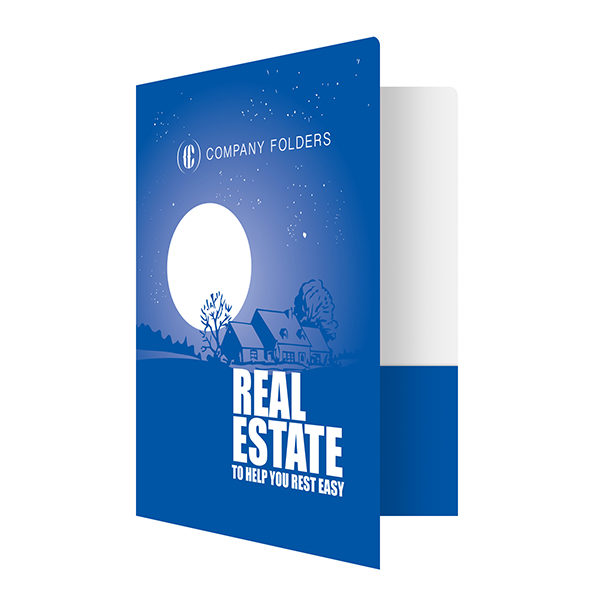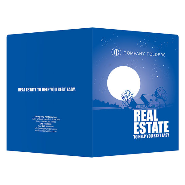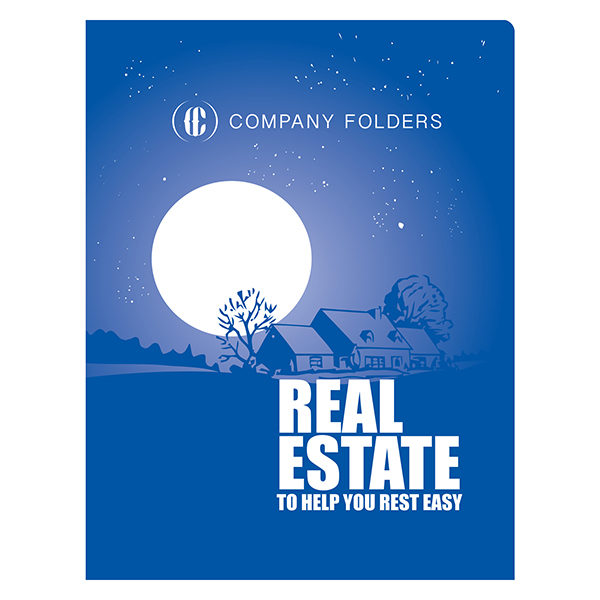 The cool dark blue color and serene nighttime scene on this presentation folder creates a calming effect for the viewer, emphasizing the safety and security that a new home can provide. The tagline reinforces this as well, reassuring clients that their real estate company will help them to “rest easy.”