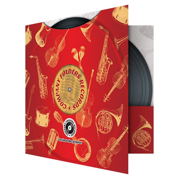 This two pocket presentation folder for a record label is decorated with various musical instruments and an eye-catching scarlet red background. It’s also printed to simulate the appearance of a real vinyl record inside.