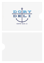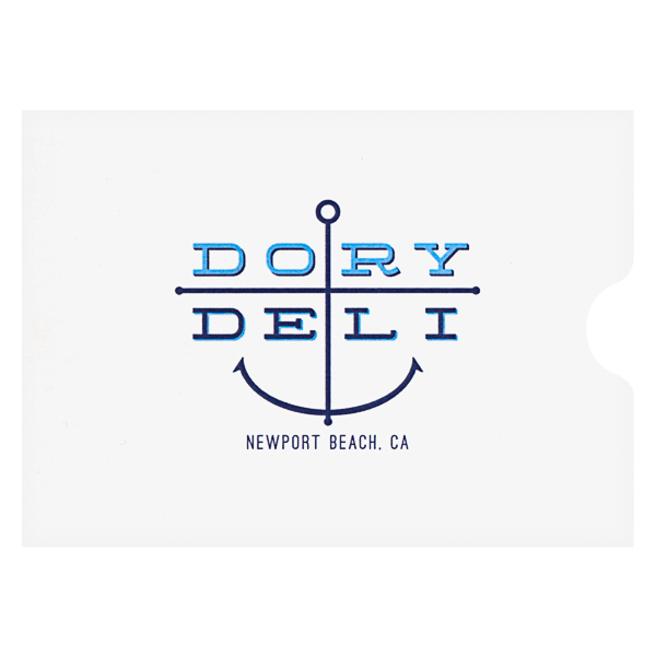 Located on the pier in Newport Beach, California, Dory Deli plays up its seaside dining with blue color branding and an anchor logo. Serif lettering looks like the names printed on the sides of boats. A line separates light blue text from dark blue, alluding to the lighter surface of the ocean and the darker depths below. The anchor points downward toward the deli's location.