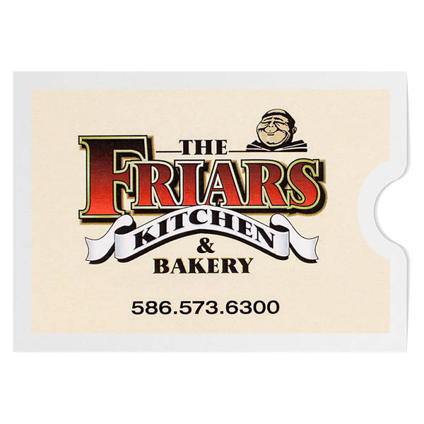Pin This GraphicA total-coverage pocket secures a standard gift card, hotel key card, or other 3 3/8" x 2 1/8" print media. Thumb notches make it easy to insert or extract the card. Portrait orientation works well for presenting brand or hotel information, such as gift amounts, check-in times, or important phone numbers. Landscape orientation's wider design canvas is better suited to photography, illustrations, or even maps. Digital printing makes images crystal clear for high-end visual impact. Print limitations apply: design elements cannot cross score lines.