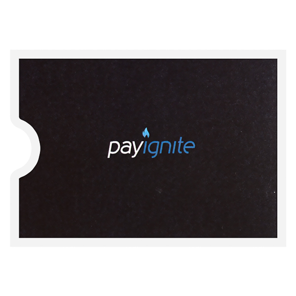 PayIgnite's white and blue logo contrasts the black panel for a sophisticated, eye-catching design. The payment solutions provider's blue flame logo covers almost half of the back panel, reinforcing the brand's identity. At left, blue and white writing carries on the color branding and makes the contact information stand out from the stark black background.