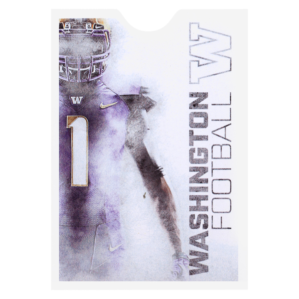An athlete emerges from the fog on the front of this design for the University of Washington's football team. Vertical text leads the eye along the side of the panel toward the opening and the school's "W" logo.
