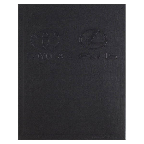 Stylish black panels welcome guests to the Toyota Kaizen Conference, which teaches Toyota workers the Japanese philosophy of continuous improvement and efficiency. Its debossed logo is recessed into the cover, relying on light and shadows to stand out from the black panels. With its slightly rough texture, the thick linen stock works with the debossed logo to help attendees form sensory memories of the conference.