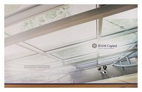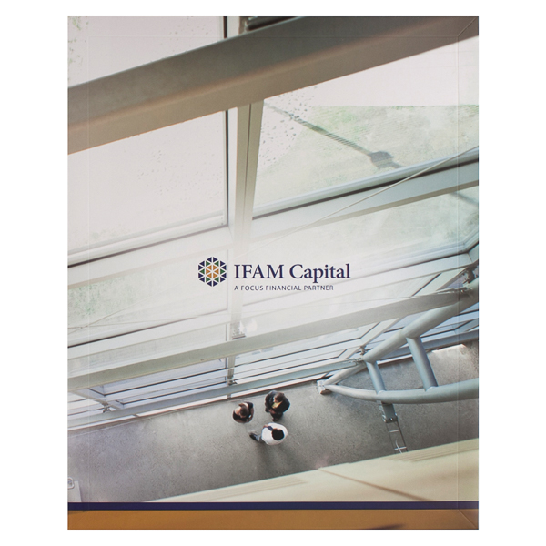 A sharply angled photo looks down the side of a glass-walled skyscraper at a group of IFAM Capital employees. The financial advisory firm's cover implies that it takes an equally unique perspective on clients' financial portfolios. The photo spreads onto the back cover, where IFAM's mission statement and contact information are located.