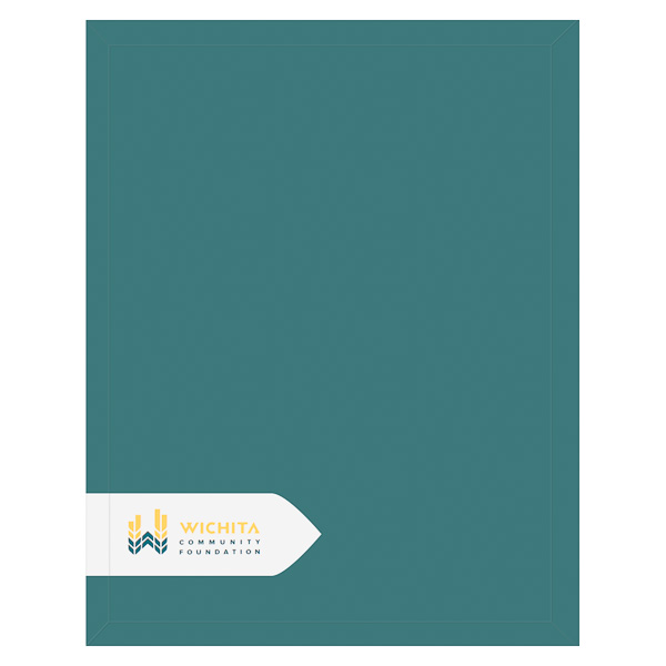The contrast of teal and orange throughout this design creates a sense of vibrant energy. Wichita Community Foundation's logo is displayed in a subtle position in the lower left corner; it uses the same color pattern to form a W.