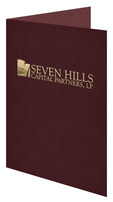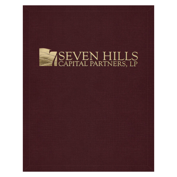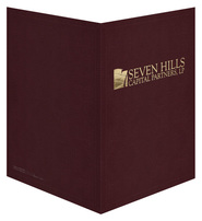 There's plenty of room for clients' paperwork in this expanding two-pocket folder from Seven Hills Capital Partners, LP. The firm's name and logo are in the center of the cover in a Metallic Gold foil stamp to add prestige to the design, as well as a smooth texture on the Merlot Linen stock.