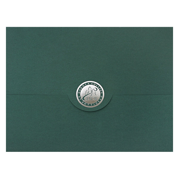 The seal of Dakota College at Bottineau is stamped in Metallic Silver and located on top of a round closure notch. This creates an interactive experience as students touch the cool, smooth seal to open the cover and retrieve the achievement certificate inside. Rich pine green stock lets the school's spirit shine, mimicking the green pine trees in the logo and in the North Dakota hills surrounding the campus. Its deep hues look stately and professional, perfectly complementing the shiny foil stamp.