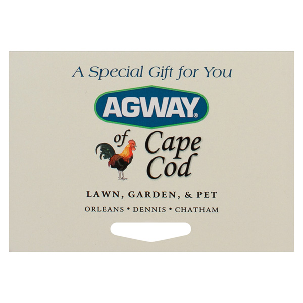 Tan panels represent Agway of Cape Cod's outdoor lawn, garden, and pet products. The blue and green Agway logo appears next to a rooster and the words Cape Cod on the front panel. Inside, gift givers can write important details.