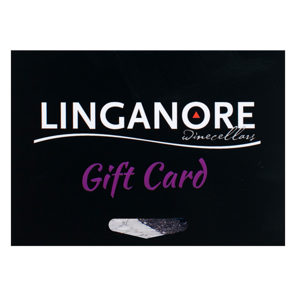 White and purple type on black panels creates a high-end look with a playful twist. A photo of the winery's main door spans the interior, giving guests a glimpse of the facility's gorgeous red-paneled walls and brick walkway. A white box makes names and amounts legible. Elegant purple script on the back highlights Linganore's "Great Wines! Fun Times!" slogan.