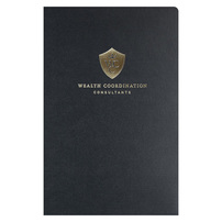 Black panels capture the sense of power associated with financial wealth. The thick linen stock's texture contrasts the satiny smooth logo. Stamped in metallic gold, the logo has plenty of glitz and glam; its reflectivity even resembles shiny gold coins, making it the perfect choice for Wealth Coordination Consultants.
