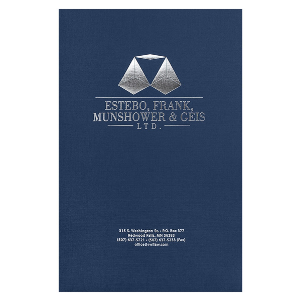 Estebo, Frank, Munshower & Geis use a professional, corporate Dark Blue Linen stock for their folder. The firm’s name takes center stage on the cover along with the Scales of Justice, showing the lawyers take their job seriously.