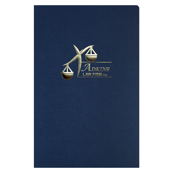 Adkins Law Firm uses a stylish take on the Scales of Justice, stamped in gold metallic foil on the cover of this design. The dark blue of the linen stock helps to convey a sense of security, safety, and trust.